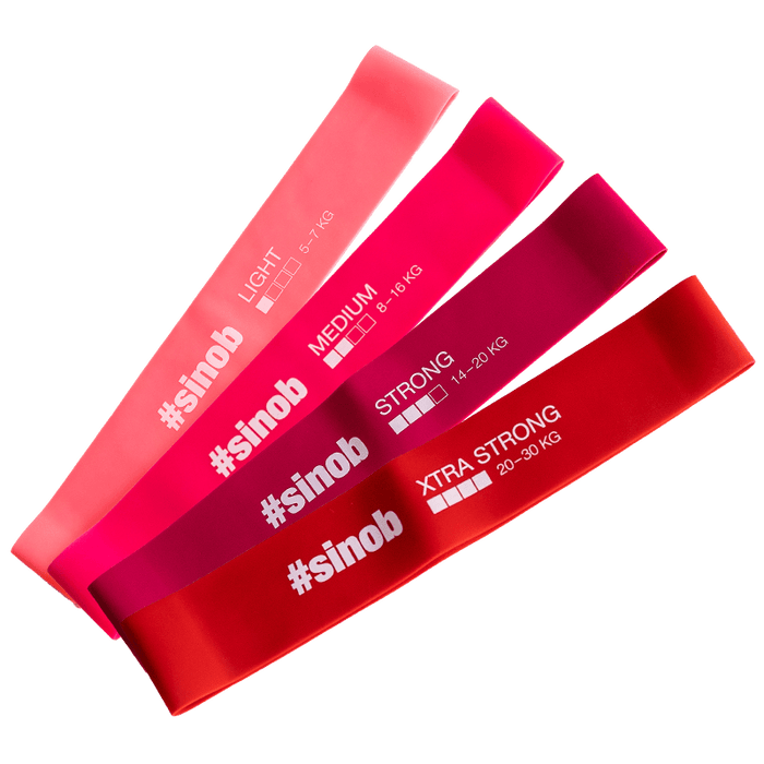 Unsere #sinob-Trainingsbänder sind die ideale Ergänzung für dein Training zuhause, unterwegs oder im Gym. Die Widerstandsbänder sind aus strapazierfähigem Naturlatex und lassen sich vielseitig in dein Workout einbauen, ob nun für dein Warm-up, zum Dehnen, für die Intensivierung deiner Bodyweight-Übungen, ja sogar für dein Krafttraining oder dein Cool-Down. Dank der 4 verschiedenen Stärken, Light, Medium, Strong und Xtra Strong, lassen sich die Übungen einfach auf dein Trainingslevel abstimmen und je nach Fortschritt steigern. Mit der praktischen, kleinen, wasserfesten #sinob-Bag lassen sie sich ideal transportieren und überall mit hin nehmen.